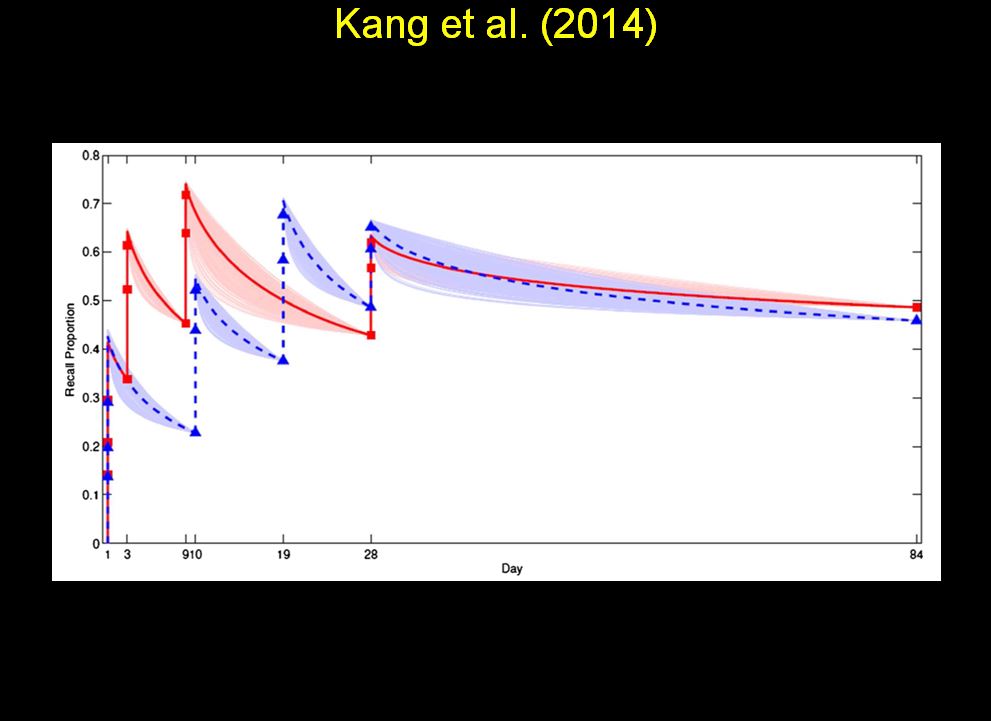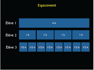 L’effet d’espacement des périodes d’étude, telle qu’il les appelle, contribue aussi à mieux ancrer les apprentissages. Ainsi, il est plus profitable d’étudier quatre fois 30 minutes plutôt que de le faire pendant deux heures. Le phénomène d’oubli s’en trouve diminué et la réactivation des connaissances augmente la rétention des apprentissages comme l’illustre la figure 2.