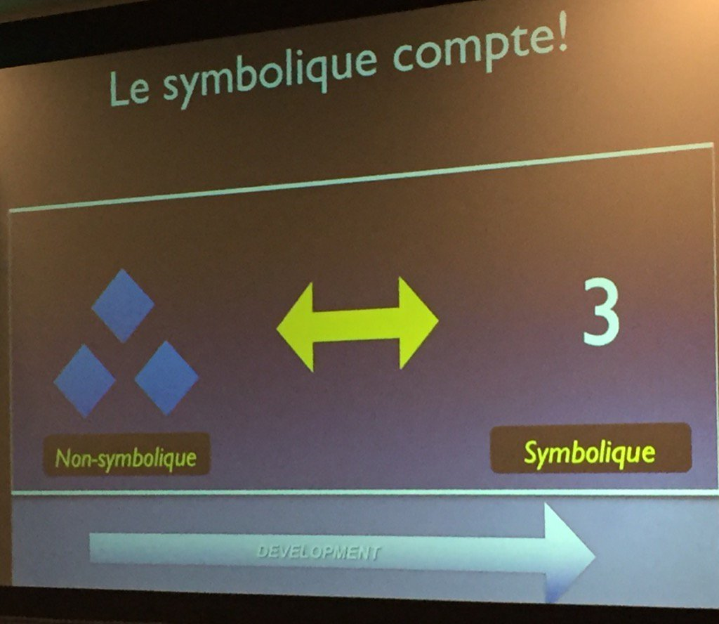 Il y a été notamment question du sens de quantité précurseur du sens des nombres chez les enfants. Ils en seraient dotés dès l’âge de 6 ou 9 mois; tout comme plusieurs animaux de l’espèce d’ailleurs. Ce sens de quantité qui s’appuie sur une connaissance non-symbolique des nombres ouvrirait la voie à la compréhension symbolique des mathématiques. Autrement dit, trois objets quelconques sont une représentation non-symbolique essentielle à la compréhension du chiffre trois (symbolique).