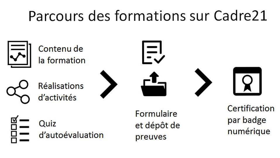 Une fois inscrits, les enseignants ont accès à de la documentation préalablement sélectionnée pour sa pertinence, par des experts de contenu. Ce corpus permet donc aux apprenants d’explorer et de cheminer en ayant accès à une foule de données, de témoignages d’experts ou de collègues. Finalement, une fois le parcours terminé, l’apprenant est en mesure de procéder à la demande de son badge. Libre à lui de s’inscrire dans un autre par la suite. À la différence d’un MOOC ou de formations plus traditionnelles, le parcours de formation proposé par le CADRE21 ne requiert aucune présence ni suivi d’un horaire commun. Les contraintes de lieux et de temps qui sont les principaux obstacles à la formation continue viennent de s’effacer avec cette offre du CADRE21.