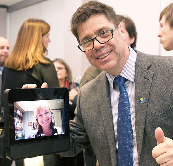 Jacques Cool, coordonnateur du CADRE21 et moi-même, coordonnateur au développement pédagogique, avons sillonné le Québec et le Canada l’automne dernier, afin de préparer la venue du Centre d’Animation, de Développement et de Recherche en Éducation pour le 21e siècle www.cadre21.org à une quinzaine de groupes distincts. Nous avons procédé à l’inauguration officielle des lieux et de son site Web le jeudi 21 janvier dernier en compagnie d’acteurs de l’éducation, actuels et des premières heures, d’enseignants, de chercheurs, d’hommes et de femmes politiques, de gens des médias, d’administrateurs et bien évidemment d’élèves; puisque c’est pour eux que nous cherchons constamment à améliorer la pratique des professionnels de l’Éducation. Un robot de téléprésence a permis à Sylvie Blain, professeur de didactique du français à l’Université de Moncton au Nouveau-Brunswick et à Christophe Batier, directeur technique du service Icap à l’Université de Lyon 1 de participer à l’inauguration et de s’entretenir avec les invités sur place, et ce, malgré la distance.